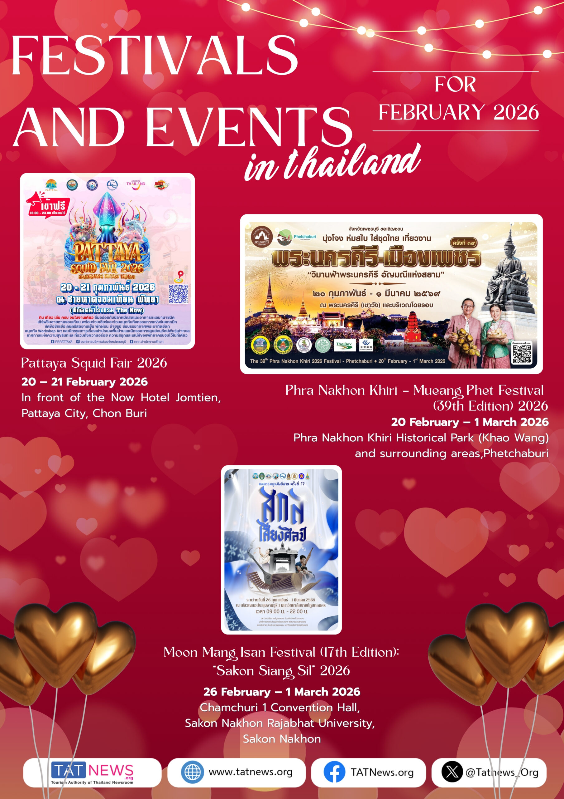 • Pattaya Squid Fair (20–21 februari, Chon Buri): culinaire markt met inktvis, muziek en strandactiviteiten.