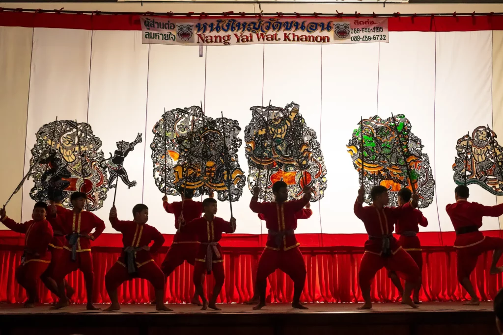 In de serene en bijna meditatieve sfeer van Wat Khanon, in het district Photharam in de provincie Ratchaburi, klinken plots de verfijnde klanken van een traditioneel piphat-orkest. Op het witte scherm komen grote zwarte silhouetten tot leven. Dit is Nang Yai, een van de zeldzaamste en best bewaarde vormen van Thais cultureel erfgoed.