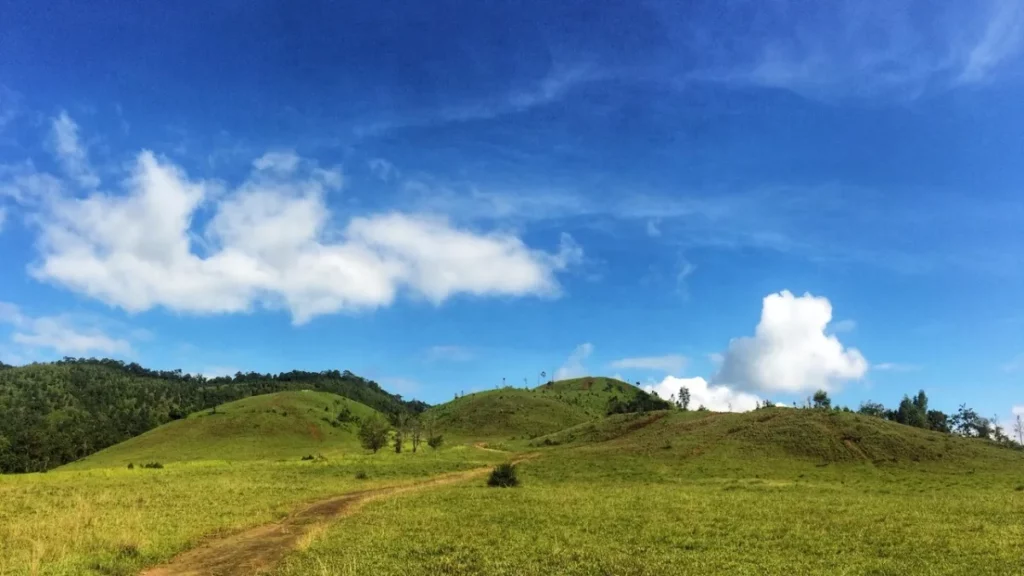 Een unieke geografische anomalie: een glooiende heuvel die volledig boomloos is en bedekt met gras dat met de seizoenen mee kleurt (groen in de regentijd, goudgeel in de zomer).