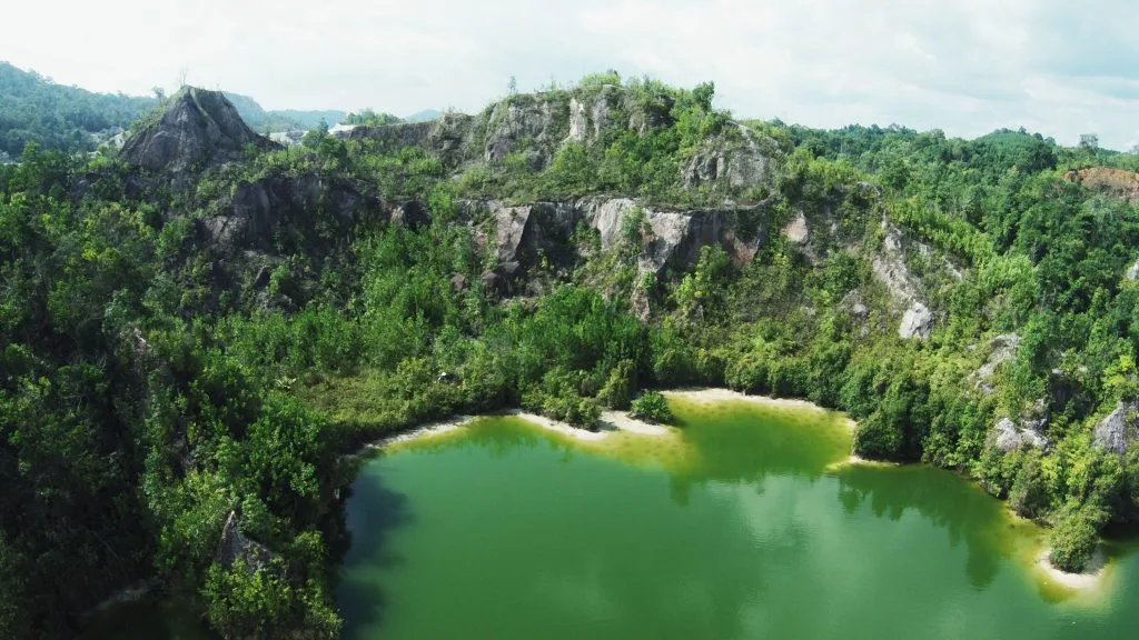 Een voormalige tinmijn die is volgelopen met water, omringd door steile, witte rotswanden en dennenbomen. Dit zorgt voor een heel uniek landschap !